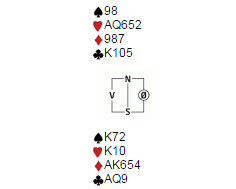 Jeg sitter i øst og spiller 3NT etter at syd i tredje hånd åpner 2 spar (svake 2, vid betydning i tredje hånd). Når makkeren min i vest nå melde 3hj satser jeg alt på det gode sparstenget mitt og lett gående kløveren, og legger kontrakta i 3NT. Syd finner beste utspill med ruter-3.
