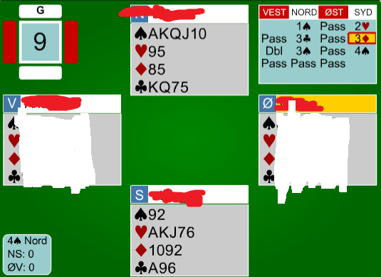 Du spiller lagkamp og har blitt spillefører i 4 spar etter meldingsforløpet under.