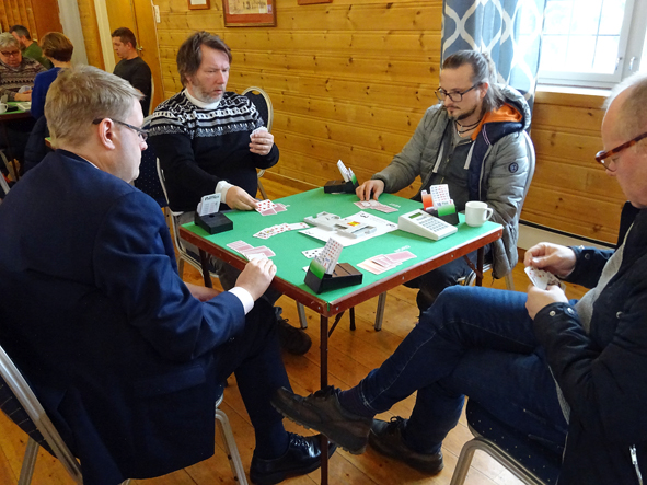 Geir Morten- Reidar og Festus - Ekren er videre til 4-runde i NM klubber. I tredje runde møtte de et sterkt lag fra Ålesund, Grand BK 1. På forhånd var nok gjestene favoritter, men kampen endte med solid seier til våre gutter. Ved halvtid ledet Sunndalsør med 16 IMP og i andre halvrunde økte forspranget til 27. Nå får vi håpe på at vårt førstelag slår Averøy i sin kamp, og kanskje kan vi håpe på internmøte i 4.runde !!