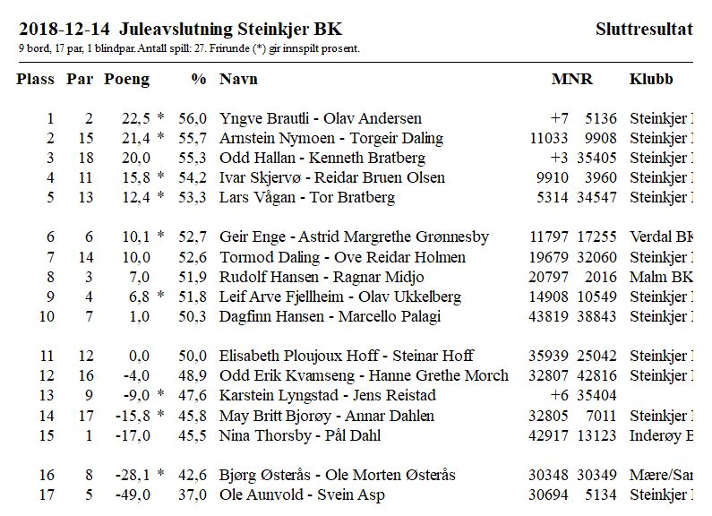 Sammenlagt etter to kvelder leder Jens H. Gundersen - Jan Steinar Mydland med 1244. Kurt Ellingsen - Arne Tveiten har 1130 og Tone Torgersen - Stein Winæs har 1092.
