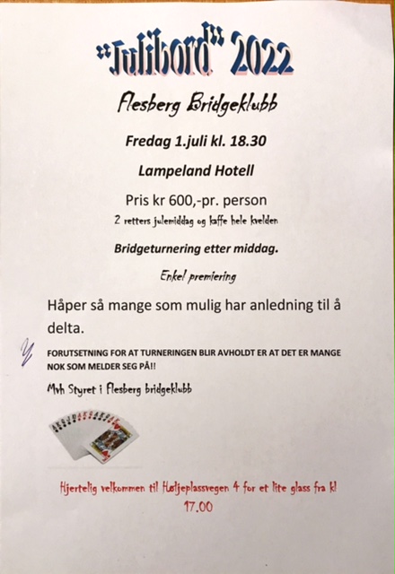 Jeg fant ut at bud 5 ruter måtte sise sterke kort med god trumftilpasning g kelst forstås som exclution Blackwood der antall ess utenom skal meldes. Men da svar 5 hjerter kom fra Tone Annette skulle det jo vise tre eller ingen ess. Men usikker som jeg var der vi var presset maksimalt valgte jeg å løfte til 6 hjerter. Vi var alene om å melde så høyt, og da Roar hadde sp D9- hj 8- ru AKDJ09842 kl 52 vant Olsen sine 12 stikk ved å fiske opp hj K som Evensen satt ,med i Nord. Julekveld! Makker hadde jo med sp 1063- hj 107432- ru 10- kl AK108 ikke særlig sterk hånd!