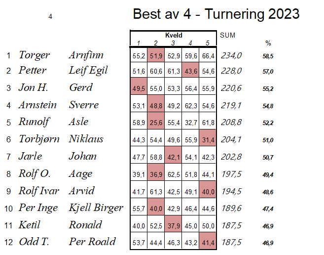 Vil også gratulere Torger og Arnfinn med seier i 5-kveldsturneringen der dårligste resultat strykes.
