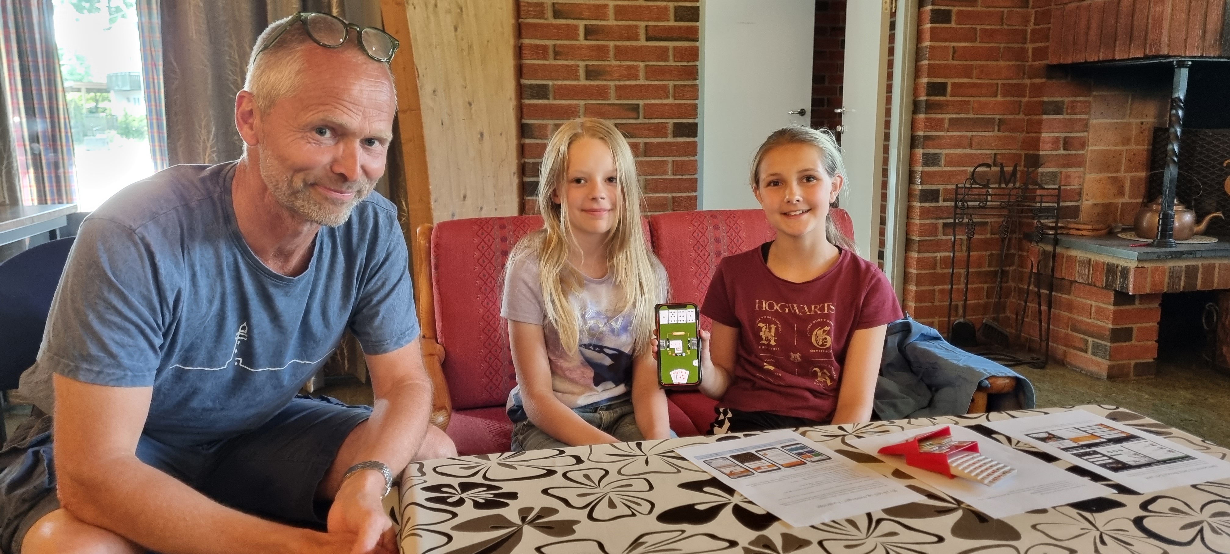 På bildet ser vi klubbens leder og hovedansvarlig for Skolebridge-prosjektet Gorm Norstad sammen med Elise og Asora fra 6.klasse på Tindlund barneskole. Som vi ser, er Funbridge installert på mobilen.