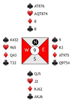 Etter åpningen 1 hjerter fra Niels kom 2NT fra øst - begge minor. Einar Moen (syd) doblet, interesse for å straffedoble. Niels har imidlertid ikke typiske kort for motspill, men la oss nå se...