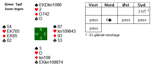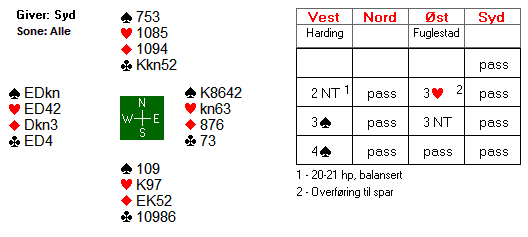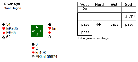 1 kl(4+)- 1 ru(4+)/ 1 hj(4)- 1 sp*(4.farge krav)/ 2 sp(4)- 4 NT*/ 5 sp (hjA+spKD)- 5 NT/