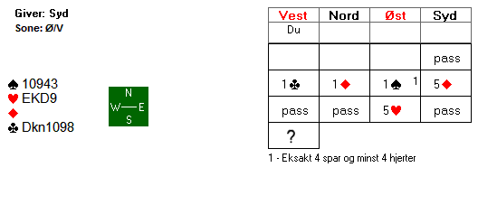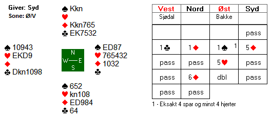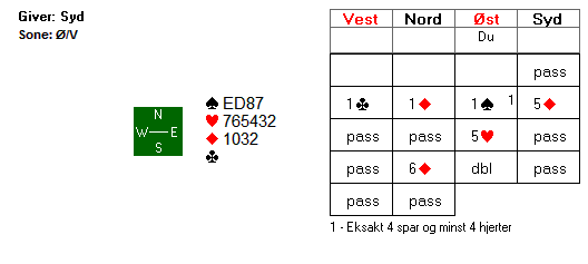 Vest tok rimelig nok for E K i spar og ventet så på 2 kløverstikk. +100 og uavgjort spill, men hvis du er grådig nok kan du doble og innkassere 500 ved å skifte til ruter i stikk 2. Som man ser hadde ikke motparten noen bedre kontrakt på 5-trinnet denne gangen.